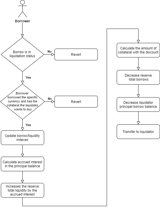 Each market specifies a maximum loan to value ("LTV") ratio that a user must observe in order to avoid a liquidation event. If a user exceeds the LTV ratio, a portion of their outstanding loan becomes eligible for liquidation. There is the option to repay currency borrowed or add collateral, but if a user fails to do so, other users can pay off a portion of the loan at a discounted rate (10% discount) and seize collateral.